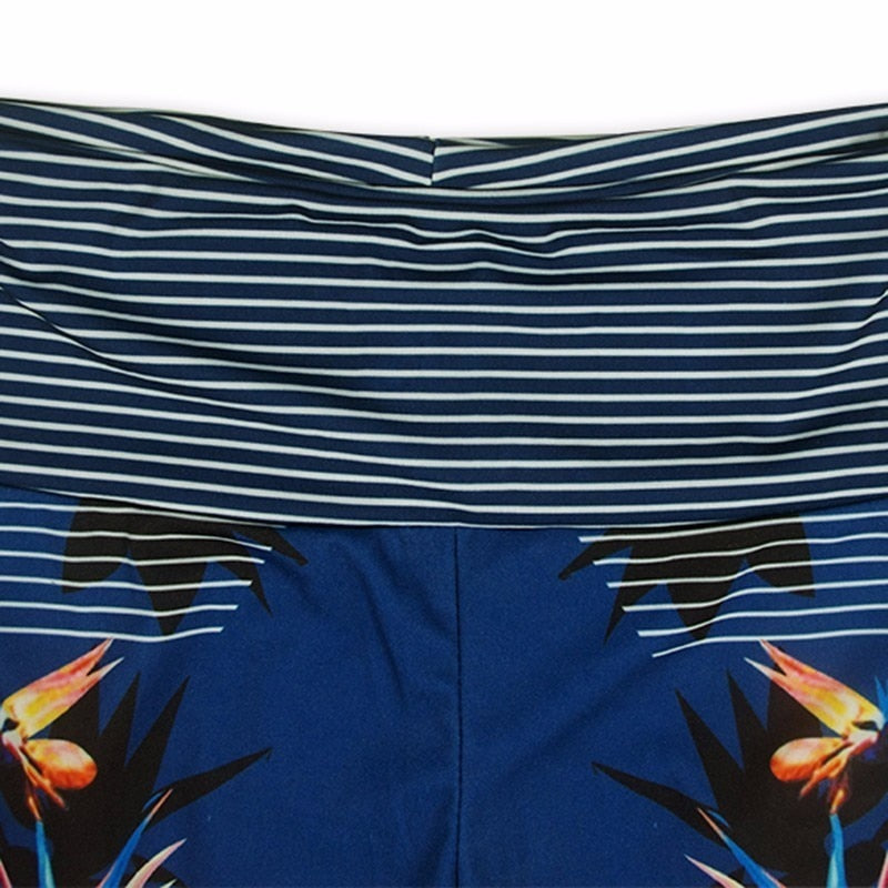 ➡️ High‑waisted yoga leggings with stripe & leaves print design | Elastic polyester fabric for comfort & flexibility